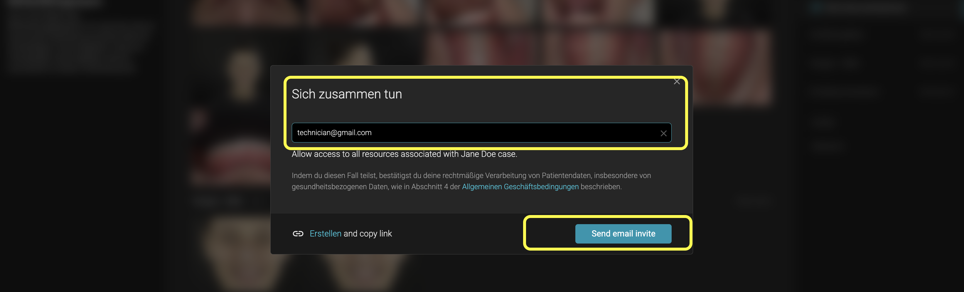 Mit Sich-Zusammen-Tun kannst du vertrauenswürdige Kolleg:innen direkt zu einem Fall einladen – so, als wärt ihr in derselben Praxis.