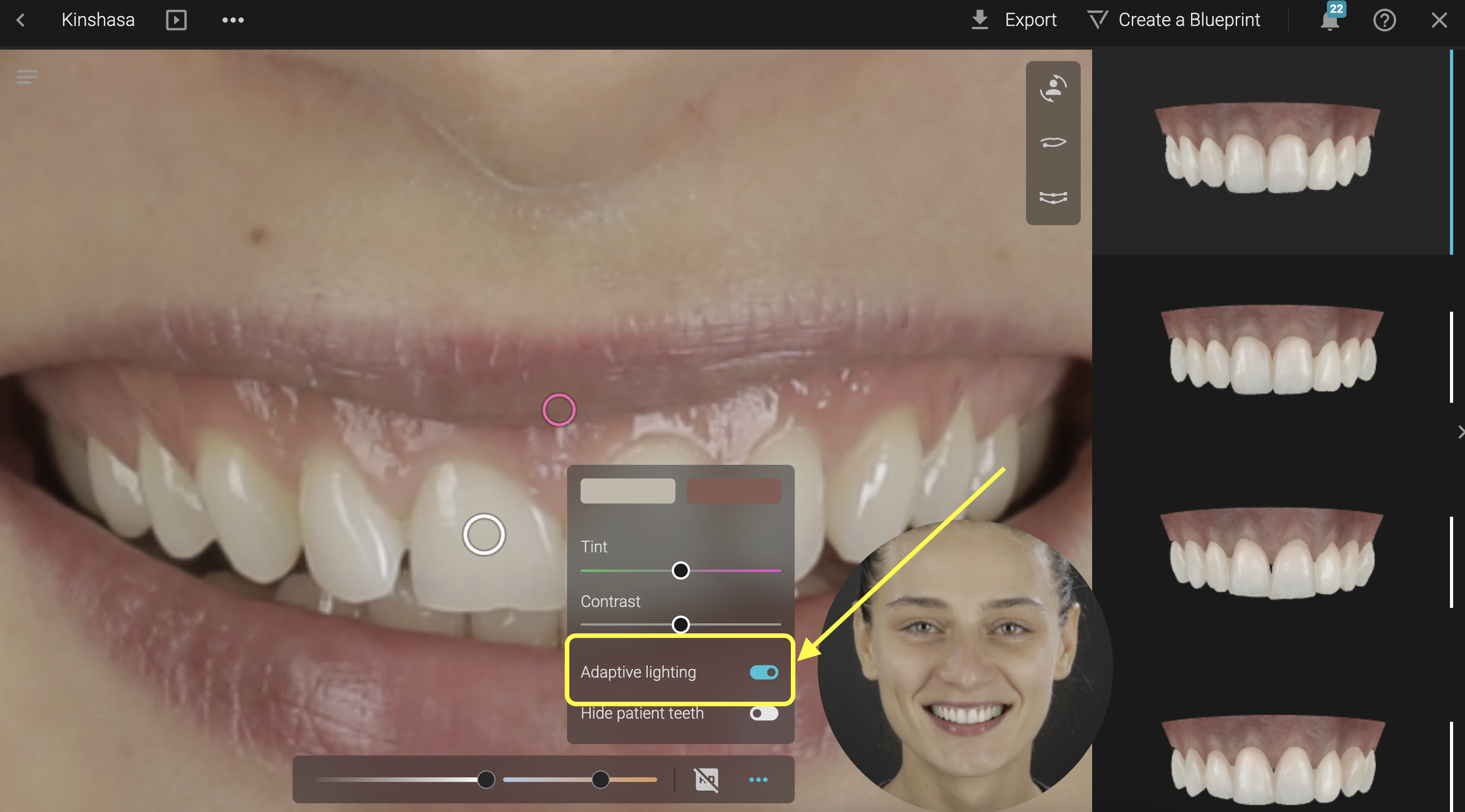 In these conditions, Adaptive Lighting improves brightness balance and color accuracy without distorting tooth shade.