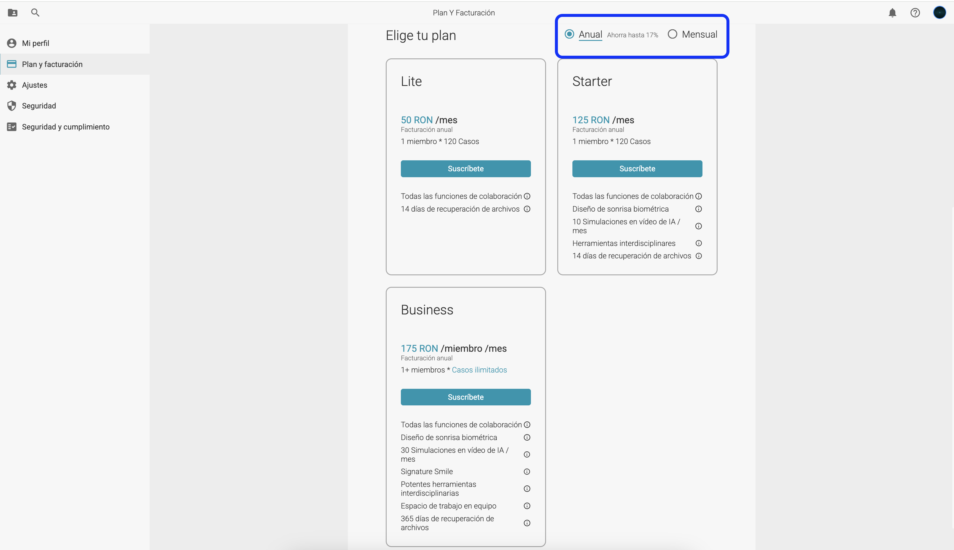 En la página de Planes, selecciona Anual o Mensual usando el interruptor de la parte superior.