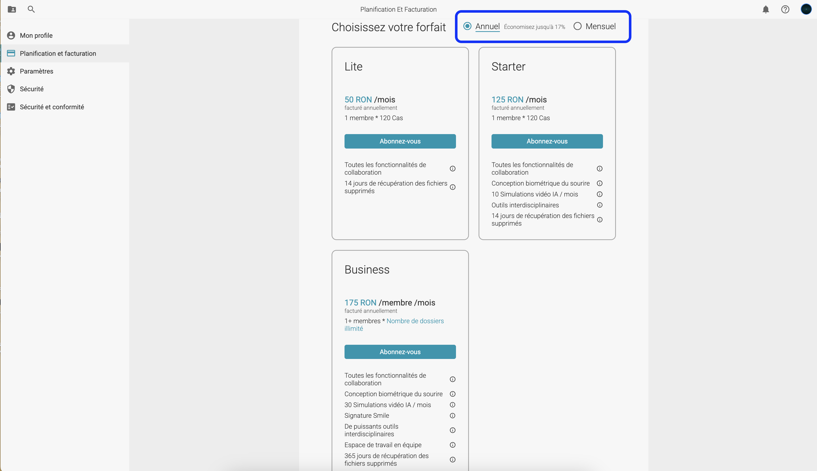 Choisissez votre offre (Lite, Starter ou Business), puis cliquez sur S’abonner sur la carte correspondante.
