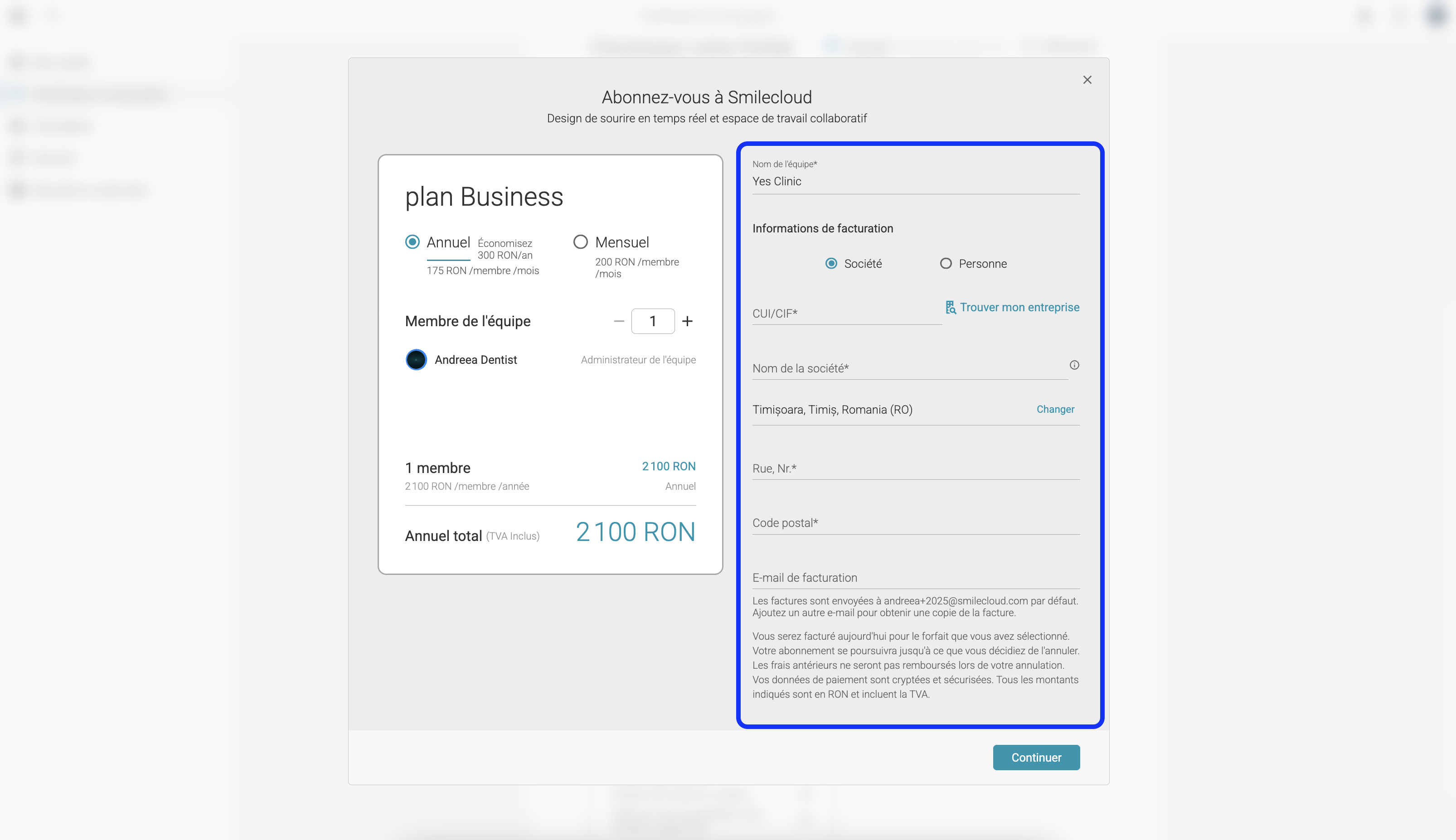 Une fenêtre s’ouvre avec l’offre, le cycle de facturation et les membres actuels de l’équipe.