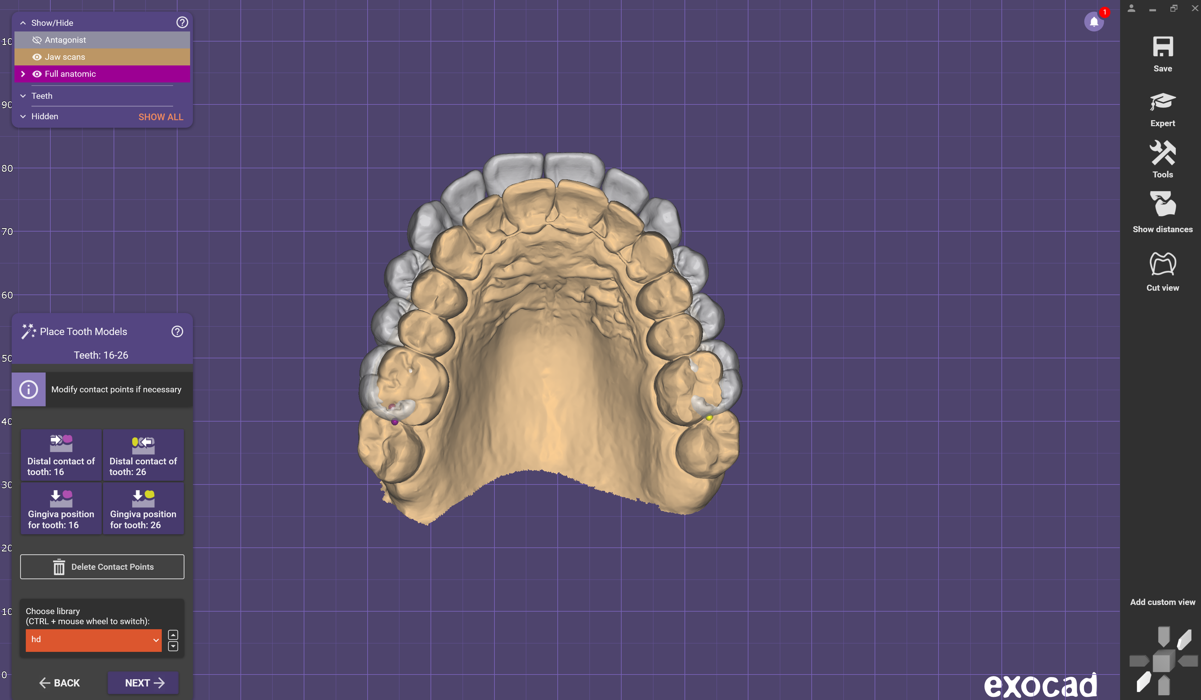 - Escolha qualquer dente de biblioteca genérica do Exocad e posicione-o no arco.