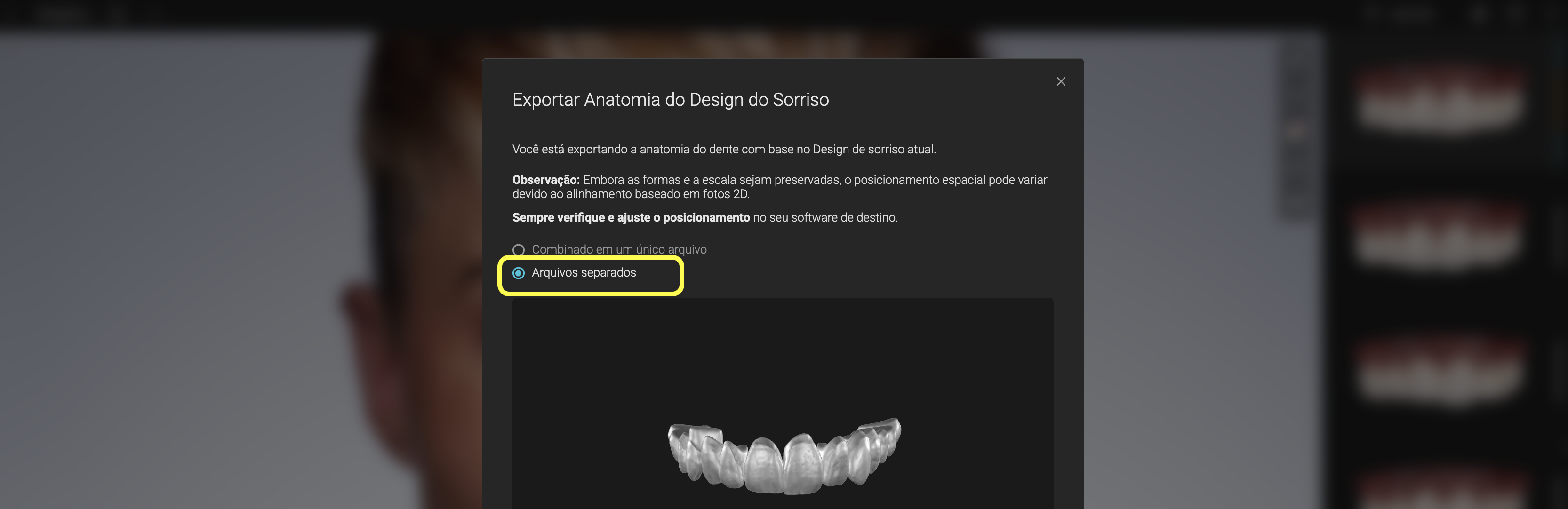 - Escolha a opção "Arquivos Separados" e clique em Download (isso fará o download de um arquivo ZIP contendo os modelos STL dos dentes projetados).